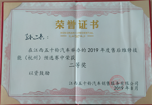 為進一步提高江西五十鈴客戶滿意度,提升售后綜合服務水平,8月13、14日兩天,江西五十鈴汽車銷售服務有限公司在全國組織2019年售后維修技能大賽活動,修理公司孫二兵同志代表連云港地區(qū)選手參加了杭州段的預選賽。比賽中,孫二兵同志憑借著扎實的理論基礎和熟練的操作技能,在激烈的比賽中獲得個人二等獎的好成績。