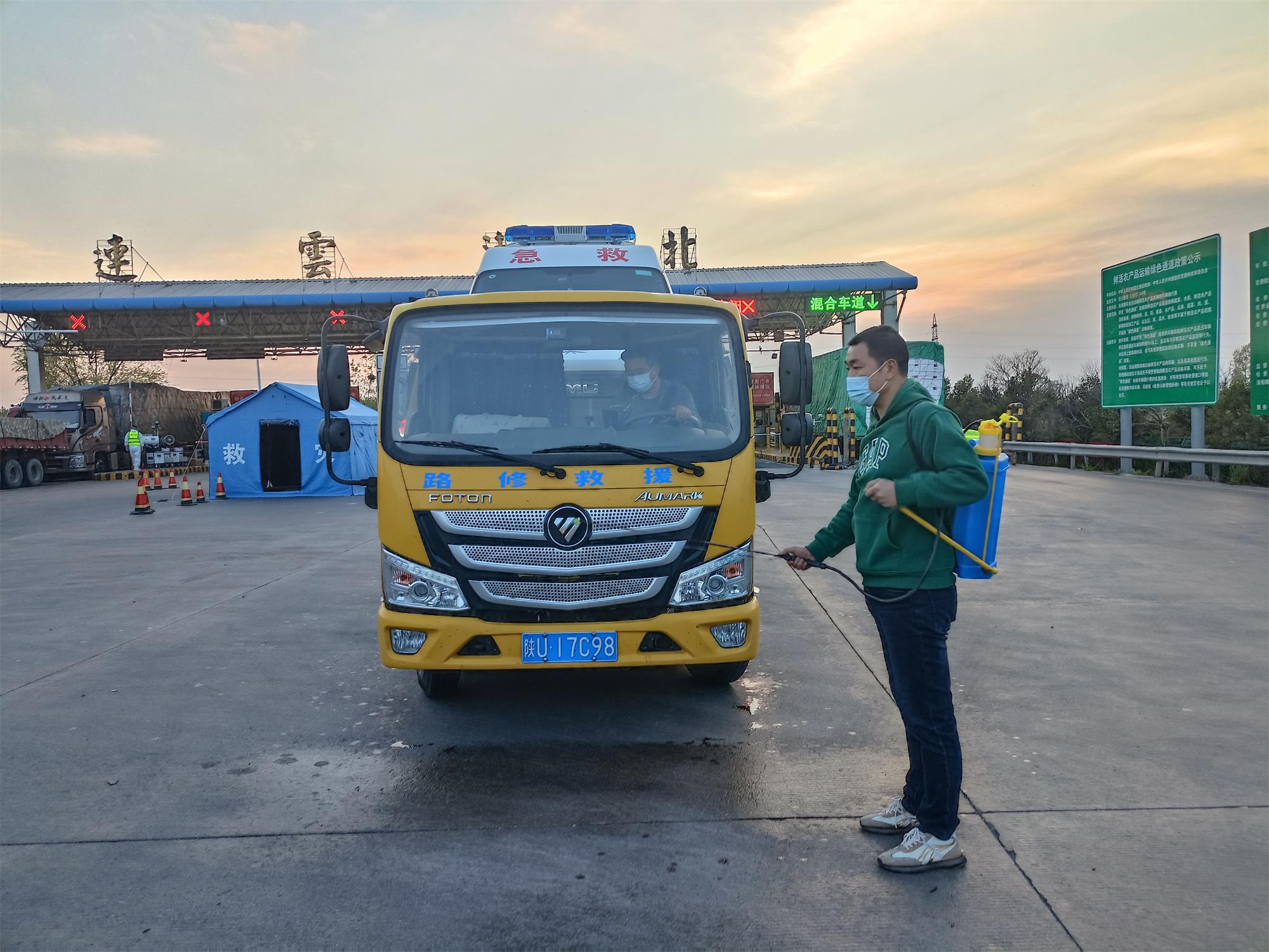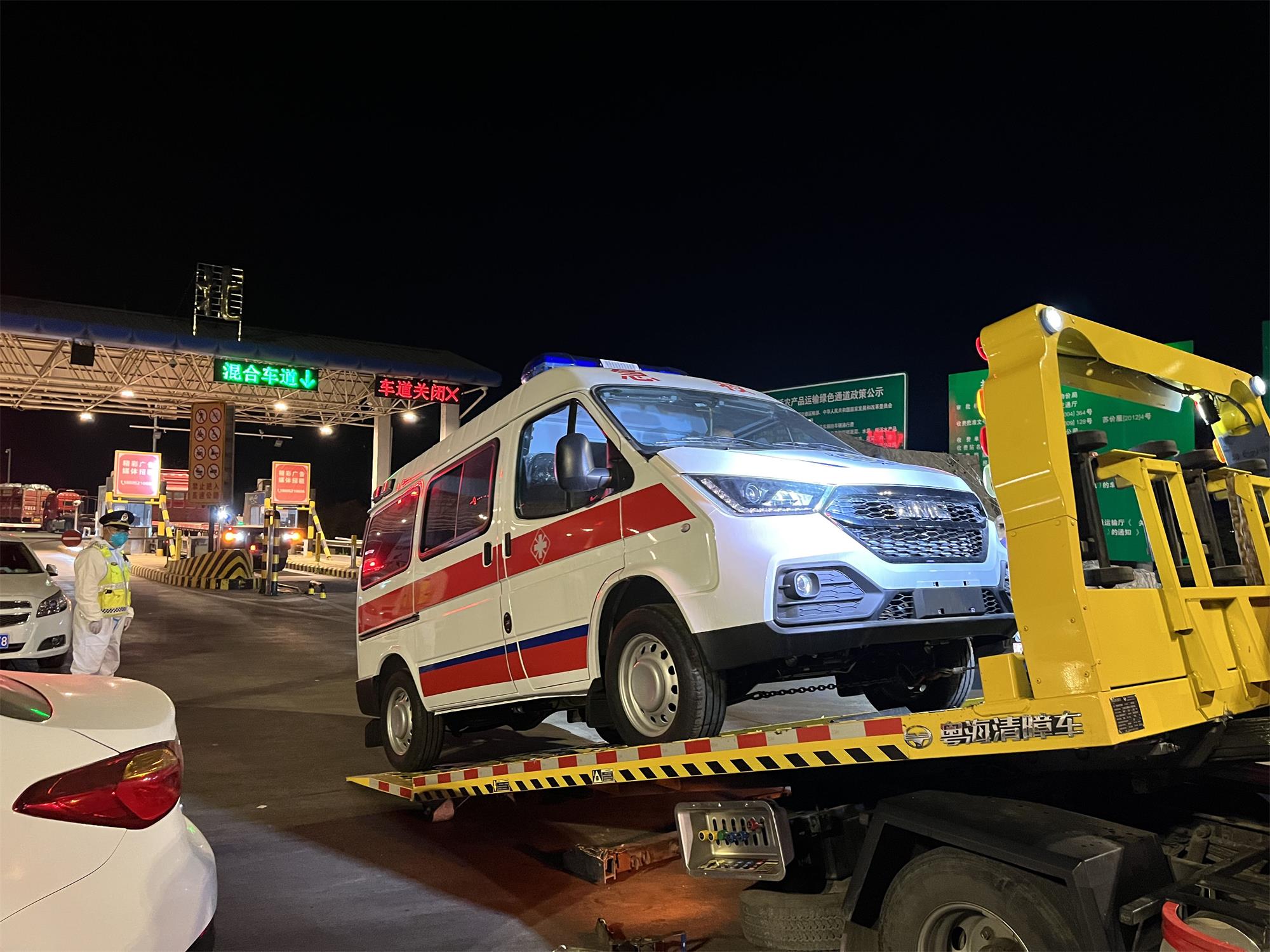 當(dāng)日下午6時整,一輛載有救護(hù)車的陜U17C98牌清障車緩緩駛出連云港北收費(fèi)站。因疫情管控需要,銷售事業(yè)部嚴(yán)格落實防疫措施,提前做好來連返連運(yùn)輸車輛人員自主申報工作,準(zhǔn)備好消殺噴霧器、免洗消毒液、醫(yī)用酒精等防疫工具。在清障車抵達(dá)時,通過與管控部門多次溝通協(xié)調(diào),本著貨運(yùn)駕駛員不開窗不開門的原則,銷售人員對所載及駕駛車輛進(jìn)行360度全方位消毒,待一系列防疫工作檢查合格后,成功接回救護(hù)車。救護(hù)車被卸下后,相關(guān)人員立即安排市區(qū)清障車將其轉(zhuǎn)運(yùn)至客戶指定地點。