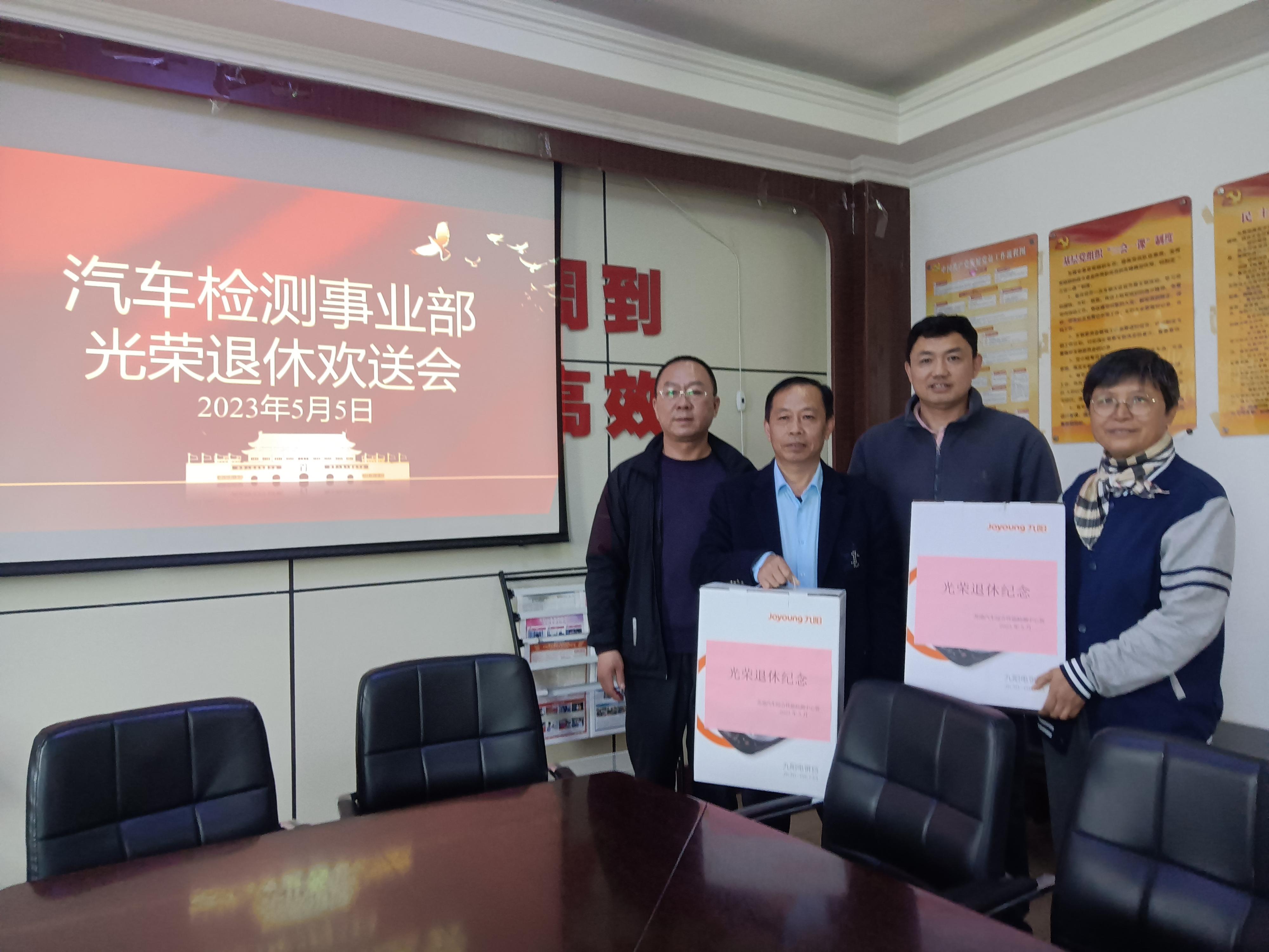 汽車檢測(cè)事業(yè)部工會(huì)為在2023年4月期間先后退休的徐毓春、王建花、郭連斌、王德才四名職工舉辦榮譽(yù)退休儀式。榮退儀式由汽車檢測(cè)事業(yè)部工會(huì)主席李強(qiáng)主持。