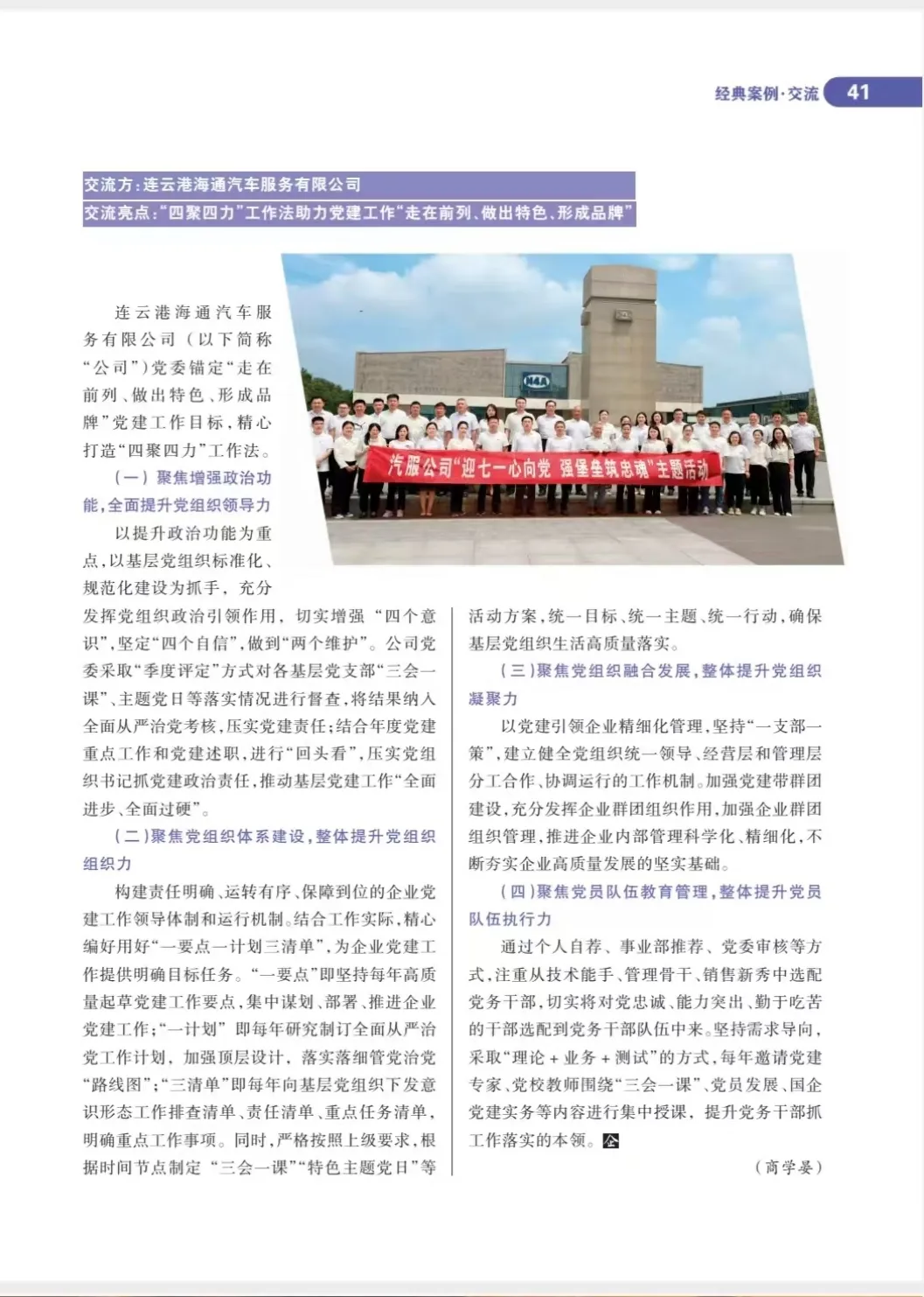 近日,《企業(yè)黨建》雜志2025年第6期“經(jīng)典案例·交流”專欄刊發(fā)文章《連云港海通汽車服務(wù)有限公司“四聚四力”工作法助力黨建工作“走在前列、做出特色、形成品牌”》。這是汽服公司在全國國有企業(yè)黨建領(lǐng)域方面的一次發(fā)聲與展示,現(xiàn)將全文轉(zhuǎn)載如下: