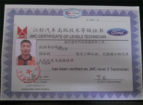 修理公司劉玉彩被江鈴汽車正式認(rèn)定為高級(jí)技師