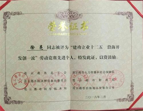 在國(guó)家“十二、五”經(jīng)濟(jì)建設(shè)活動(dòng)中,涌現(xiàn)出了許許多多創(chuàng)先爭(zhēng)優(yōu)、建功立業(yè)、團(tuán)結(jié)協(xié)作、積極奉獻(xiàn)的先進(jìn)個(gè)人和感人事跡。為樹(shù)立典型,表彰先進(jìn),2015年底,連云港市總工會(huì)等6家單位聯(lián)合開(kāi)展“建功立業(yè)十二五,沿海開(kāi)發(fā)創(chuàng)一流”勞動(dòng)競(jìng)賽評(píng)比活動(dòng)。經(jīng)企業(yè)上報(bào)、上級(jí)單位推薦,市勞動(dòng)競(jìng)賽領(lǐng)導(dǎo)小組審批,修理公司徐亮同志被評(píng)為“建功立業(yè)十二五、沿海開(kāi)發(fā)創(chuàng)一流”先進(jìn)個(gè)人榮譽(yù)稱(chēng)號(hào)。